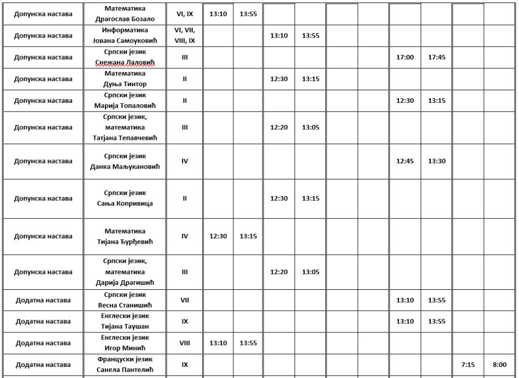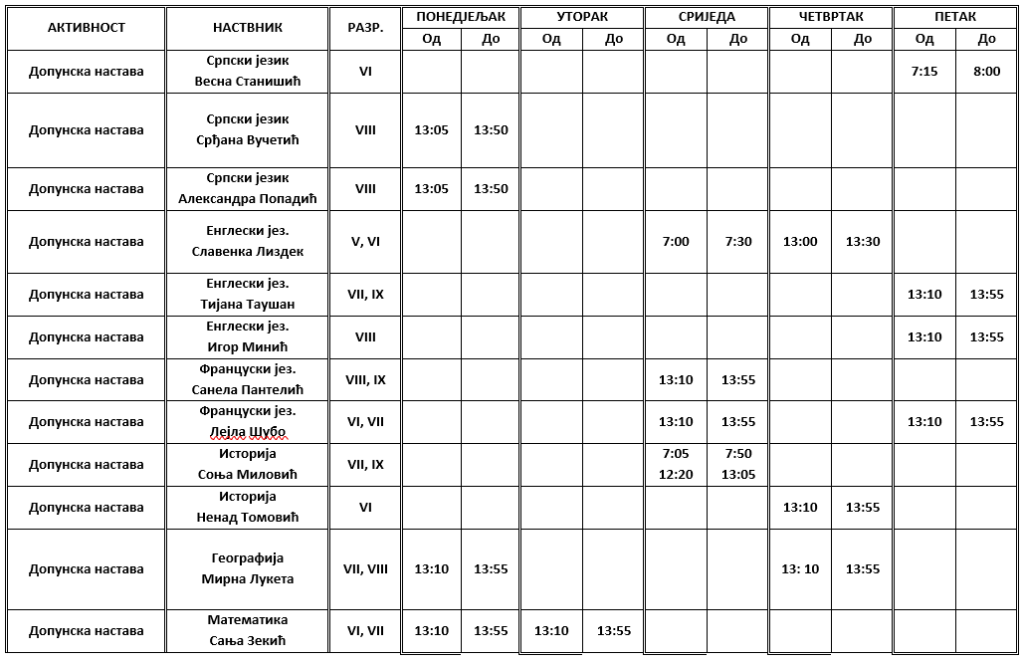 РАСПОРЕД РАДА ДОПУНСКЕ И ДОДАТНЕ НАСТАВЕ ЗА ШКОЛСКУ 2021/22. ГОДИНУ